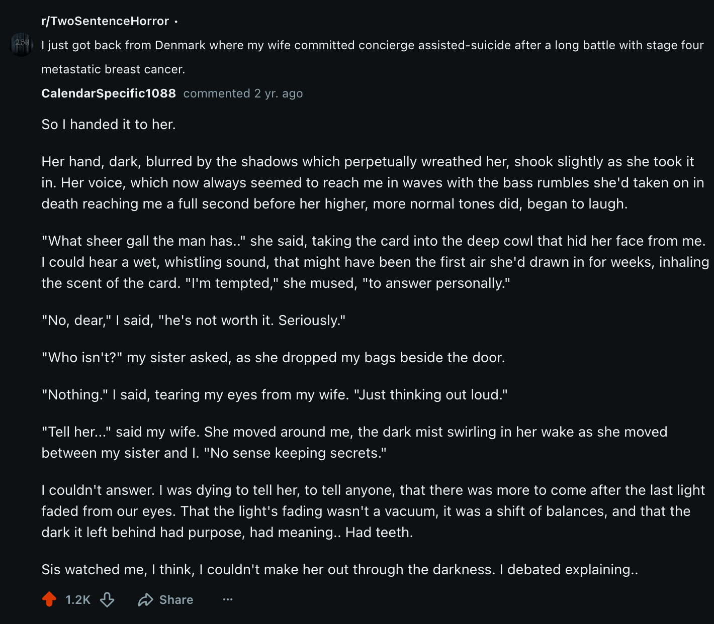 I just got back from Denmark where my wife committed concierge assisted-suicide after a long battle with stage four metastatic breast cancer.